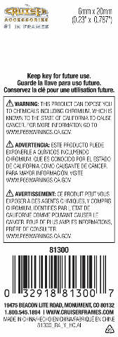 Cruiser Accessories is a family owned business that has been manufacturing and selling license plate frames for over 30 years. Through innovation, attention to detail and many patented designs, Cruiser has evolved into the largest supplier of license plate frames, novelty plate shields and mounting hardware in the automotive aftermarket. Cruiser's product line also includes both standard and exclusive Star Pin locking hardware, designer fastener caps, mounting accessories, motorcycle frames and 3d-Cals decals. Let Cruiser Accessories complete your ride's look today!
