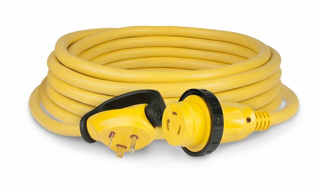 30 Amp, 125 Volt, 25 Ft. Yellow Locking Powercord Plus connects the campground or park power to your vehicle, ensuring your campsite connections are completed. Female connector: 30 amp, 125 volt locking. Attaches to RV inlet or cordset. Male plug: 30 amp, 125 volt 2-pole, 3-wire RV use only. Attaches to pedestal receptacle or cordset. Power indicator light: RV side Connector features a molded-in LED light. When it glows red, you know you have power to the RV. Swivel head handle: Allows box cover to close. Keeps hand away from dangerous high voltage contacts. Easier to insert and remove electrical plug. Meets and exceeds rigorous UL testing standards. Easy lock system locks the cord set to the inlet in just 1/8 of a turn. The tabs on the locking ring lock into the inlet for a positive watertight hookup.