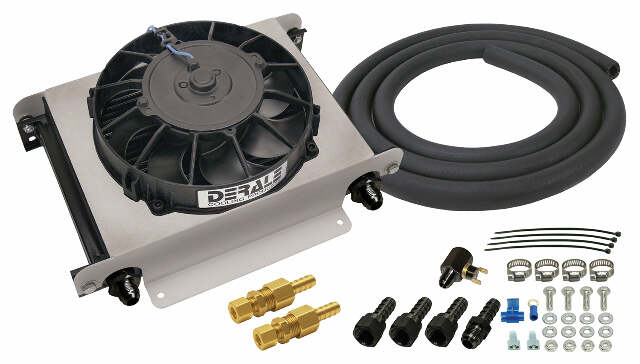 Equipped with our top-of-the-line 25 row stack plate cooler, the Hyper-Cool remote transmission cooler can literally be mounted almost anywhere. Making it a popular addition for performance cars, hot rods, muscle cars and trucks. With an all-aluminum oven-brazed Stack Plate cooler coupled with a Tornado fan and aluminum shroud, this kit comes with a complete installation kit to install easily on all vehicles with 1/2" transmission cooler lines. Also included is an 180?F in-line thermostat for activating the electric fan. The Hyper-Cool is perfect for extreme duty towing and hauling and can add years to the life of your transmission.