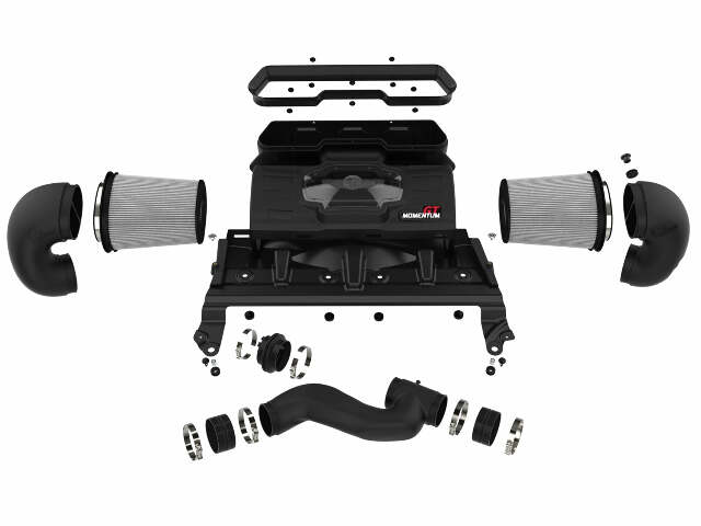 A pair of 360-degree radial flow air filters feature our oil-free Pro DRY S media with three layers of synthetic media for maximum convenience. The progressive layering provides great filtration efficiency and dust holding capacity, while not requiring the use of oils. This media is best suited for street and light off-road use. The inverted tops makes for more filter surface area, resulting in longer service intervals. Momentum's innovative filter-to-housing interface was built to feature the largest air filter possible. Once the system is installed, the air filters can be easily removed from the housing for maintenance by only uninstalling the side intake tubes. The smooth one-piece sealed housing, constructed of heat-resistant cross-linked polyethylene (XLPE), features our patent pending filter-to-housing interface. Its innovative design minimizes the total number of parts, making for an easy installation. A massive clear sight window allows for hassle-free filter inspection without having to disassemble your intake system. The housing incorporates both the factory hood air inlet scoop and the grille inlet using no additional hardware. This system features a trio of high quality, computer-designed, dyno-tuned intake tubes to achieve maximum power gains while maintaining a perfect fit. Our XLPE material is heat soak resistant and extremely durable. Stainless-steel T-bolt clamps are included for strength, and a premium silicone coupling allows for ample flexibility and durability. Momentum GT intakes are designed with fewer parts for a fast and easy installation.