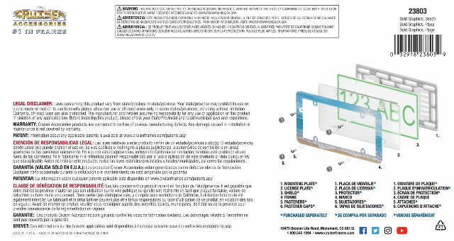 Cruiser Accessories is a family owned business that has been manufacturing and selling license plate frames for over 30 years. Through innovation, attention to detail and many patented designs, Cruiser has evolved into the largest supplier of license plate frames, novelty plate shields and mounting hardware in the automotive aftermarket. Cruiser's product line also includes both standard and exclusive Star Pin locking hardware, designer fastener caps, mounting accessories, motorcycle frames and 3d-Cals decals. Let Cruiser Accessories complete your ride's look today!