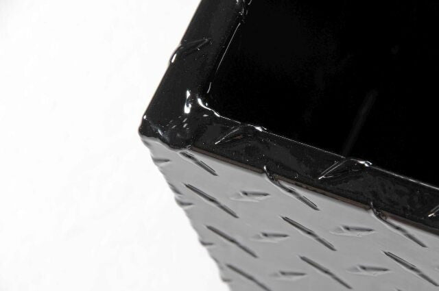Non-Rusting 0.056 Brite-Tread Aluminum w/ Protective Gloss Black Powder Coat. Perfect For ATV's - Mounting Hardware Included. Lockable Stainless Steel Paddle Handle and Dampened Gas Shock Opens At A Steady, Controlled Rate. Provides Universal Storage Options. L: 35" x W: 12" x H: 9" and Vol: 2 cu. ft.