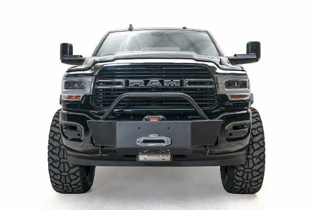 2019 Dodge HD 2500-3500; One piece W in. Mount; Fully Welded; No parts or brackets to put together; Slips through the factory tow hook slots straight to the frame; Complete bolt-on front bumper w/ provided brackets that tie directly to the frame; 2 integrated pod mounts; Holds 16,000lb or smaller w in.; 2 Stage Matte Black Powder Coat; 1/4 in. U.S. Steel Construction; 100% Made in the USA