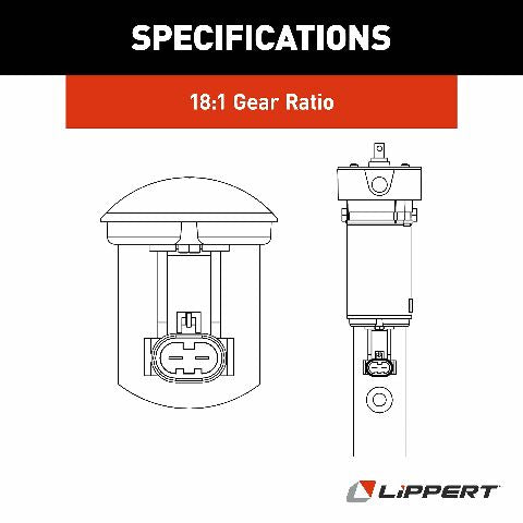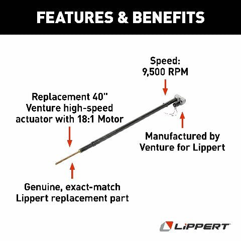 RESTORES SLIDE-OUT FUNCTIONALITY — Designed to swiftly restore your RV's slide-out functionality, our Through-Frame replacement Venture RV slide-out actuator with a motor ensures a quick return to optimal operation, minimizing downtime and allowing you to get back on the road in no time. GENUINE REPLACEMENT PART — This is a genuine Lippert replacement component designed specifically for Through-Frame slide-outs. It includes the actuator and motor only. The complete slide-out assembly is not included. COMPATABILITY ASSURANCE — Tailored for Through-Frame RV slide-outs, this replacement 18:1 Venture motor and 40" high-speed actuator is engineered to fit multiple models. Please consult your owner's manual before purchasing to ensure a perfect match for your specific system. ELIMINATES GUESSWORK — At Lippert, we provide direct replacement components, eliminating any uncertainty in finding the right part. This ensures your RV and its equipment can swiftly resume normal operation with ease. EFFORTLESS INSTALLATION — Engineered as an exact-match component, the installation process for our Through-Frame Venture RV slide-out actuator with a motor is hassle-free.