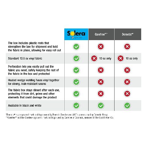 UNIVERSAL FIT — The best part about Solera replacement fabric is that it's totally compatible with Solera, Dometic and Carefree slide topper and slide-out rooms. DURABLY DESIGNED — Our replacement fabrics are fabricated with heavy-duty, 13-1/2 oz. vinyl, heat-welded seams and tested to withstand the rigors of the outdoors. COLOR OPTIONS — This fabric is available in black or white making it easy to find a color that matches your rig. THE RIGHT SIZE — Our replacement fabric comes in a 50' roll that's 50' x 48", and can be cut-to-fit so you can take the guesswork out of finding the right size for your RV. SOLERA AWNING SOLUTIONS — Solera offers a wide array of awning products and accessories engineered to enhance your camping experience. From add-on shade rooms to fabric replacement, Solera has you covered.