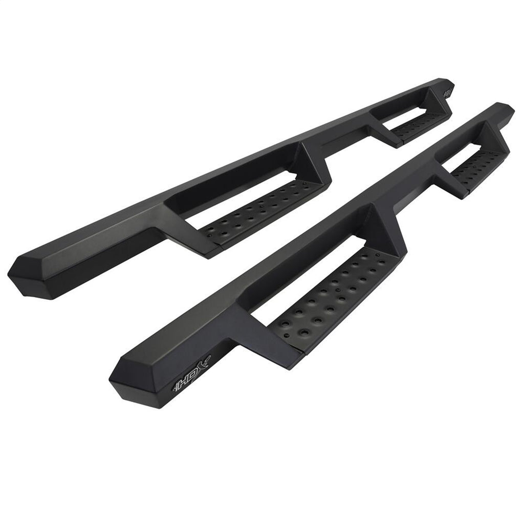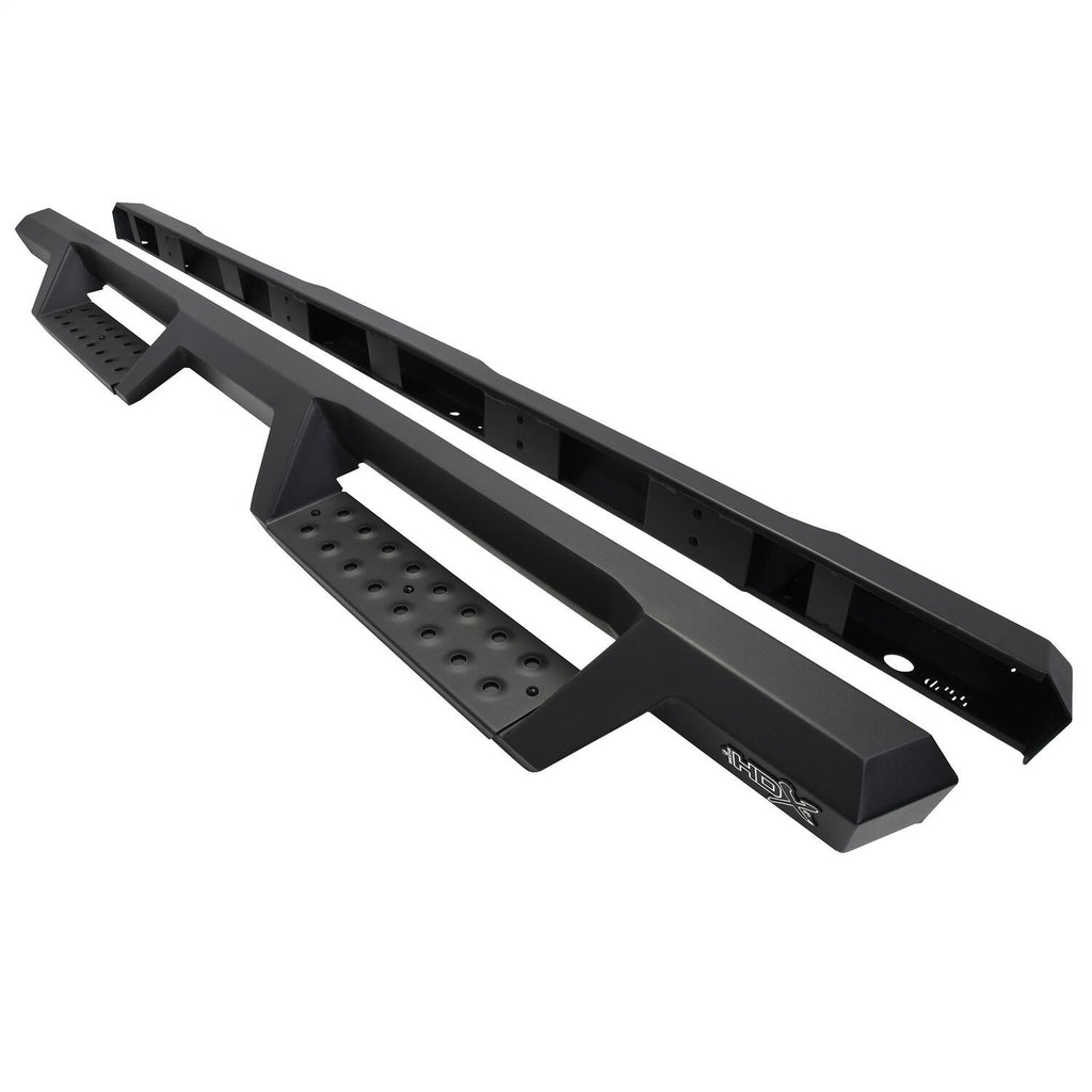 Westins HDX Drop Nerf Step Bars provide the rugged look and function that truck owners need and want. They feature a solid 1-piece steel construction and heavy duty punch plates creating high traction step areas. The HDX Drop Nerf Step Bars also feature Westins notched bar design which provides more than 2" of additional toe/heel placement versus competitive brands. Available in a textured black finish that complements Westin HDX Bumpers. The HDX Drop Steps have vehicle specific applications and include a vehicle specific mount kit, installation hardware and instructions.