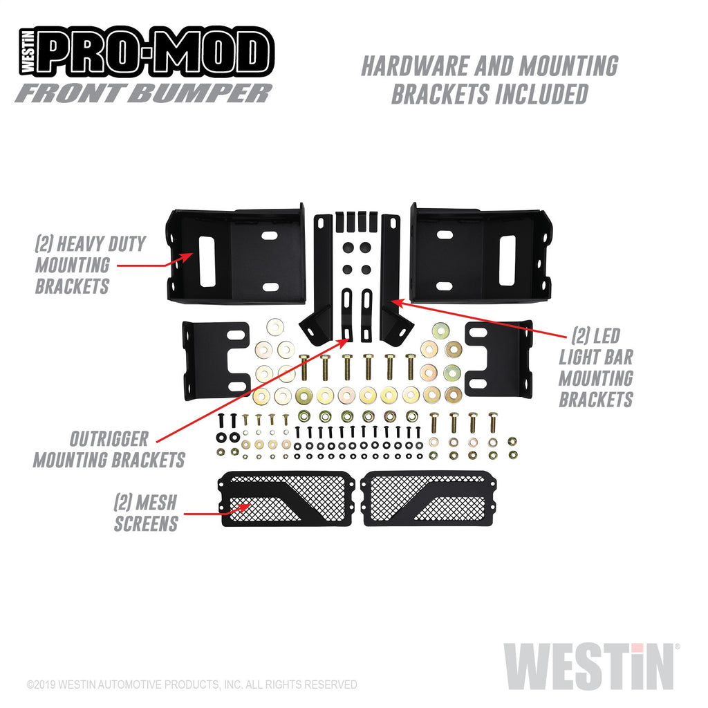 Westins Pro-Mod Front Bumper combines enhanced vehicle protection, with great looks. Pro-Mods revolutionary lightweight modular design is uniquely engineered with outrigger reinforcement brackets to provide maximum front end protection without compromising on strength, integrity or durability. The "high and tight" bumper profile creates a greater approach angle, which significantly improves off-road driving capabilities. The lightweight design also requires smaller shipping packages which dramatically reduces shipping costs. Pro-Mod bumpers feature a textured black finish with an e-coated base coat, providing long lasting corrosion protection from the elements. Once you see the Pro-Mod Front Bumper, the choice becomes obvious.