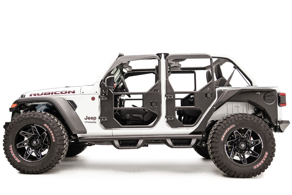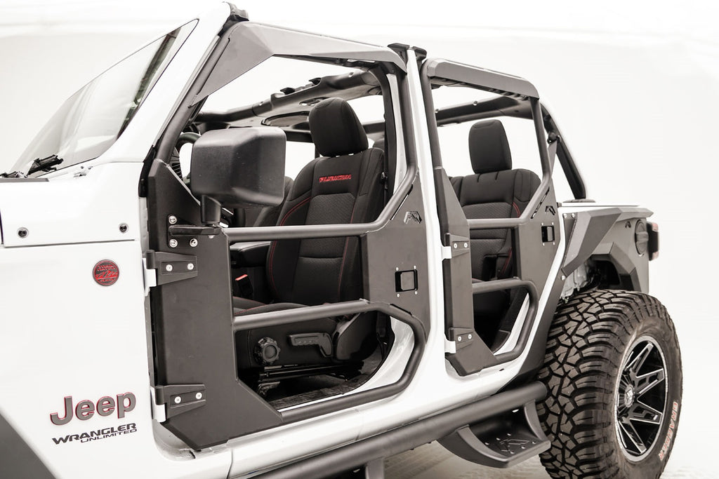 Exclusively for the Jeep JL, The Fab Fours Rear Full Tube Doors provide the ultimate in aggressive styling, functionality and durability. Experience the trails and the road the way it was meant to be, with little to no rattles, open visibility and substantial security. Key Features and Benefits include Full Surround tubing, integrated Sun Visor, solid rattle resistant design.