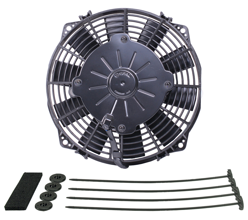 A 8" Diameter version of our high performance H.O. Extreme series of electric fans, this powerful unit uses 10 thin, curved blades to provide a low profile (only 2" at widest point) for limited space applications. Using a sealed waterproof/dustproof motor that lasts up to 3 times longer than normal electric fan motors, this puller fan is designed to provide maximum performance at high static pressure loads. Mounting kit and installation instructions included.
