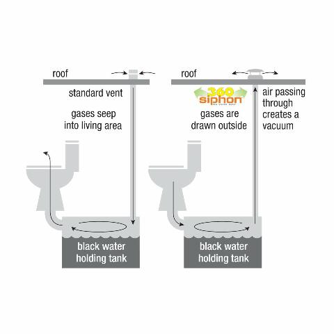 ELIMINATES ODOR - Exhausts odors out the roof vent before they have a chance to invade your RV. COMPATIBILITY - Engineered for a universal fit, the 360 Siphon is compatible with all RV vent caps. DURABILITY - Built with polycarbonate, the sophisticated, patented design of this vent has no moving parts. KEEPS PESTS OUT - A built-in screen helps ensure bugs stay out of your RV, for a worry-free camping experience. EFFICIENT DESIGN — Creates an updraft to exhaust odors through the roof vent, giving campers a healthier, breathable environment, in any wind condition.