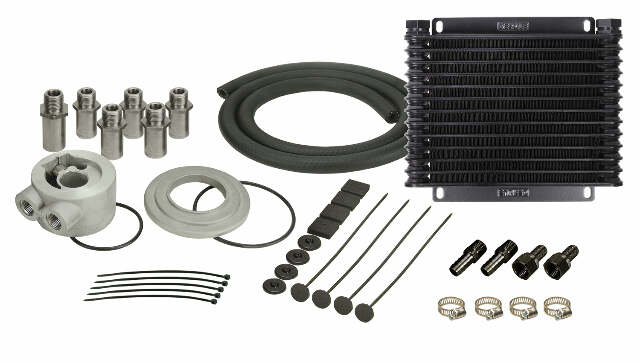 A step up from the popular tube and fin design this aluminum plate and fin-based oil cooler kit not only reduces oil temperatures to help extend the life of lower end components and oil life, it also helps reduce coolant temperatures in the radiator and cooling system. This universal kit includes engine sandwich adapter, hose and everything you need to install on most passenger vehicles on the road today.