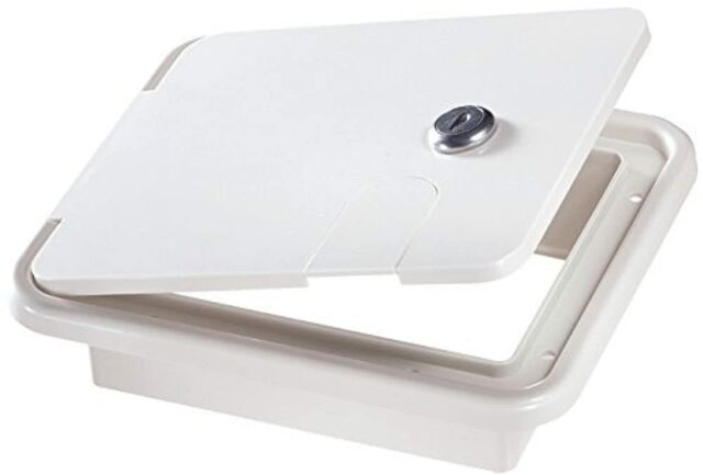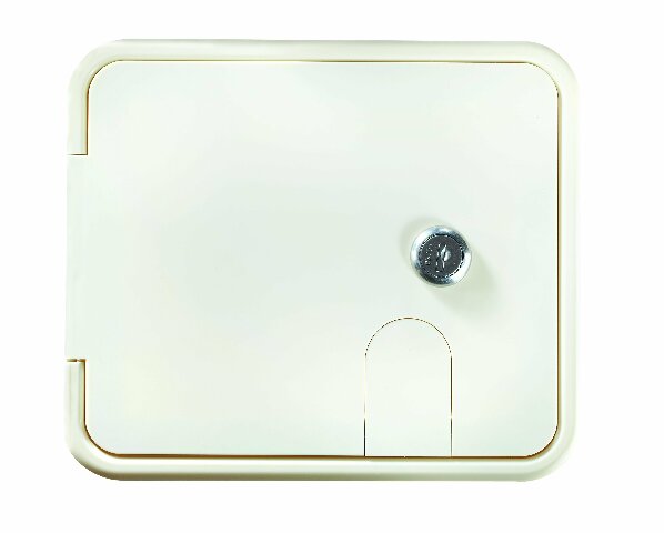 RV Designer Locking RV Electrical Hatch. Locking electrical hatch with same hole pattern/footprint as original equipment version. UV inhibited, will not yellow. Accepts up to 50 Amp. Polar White.